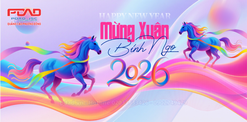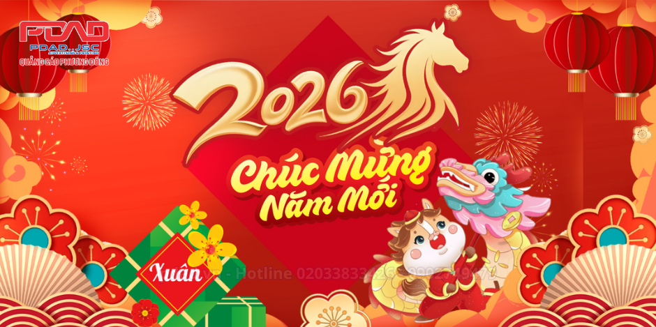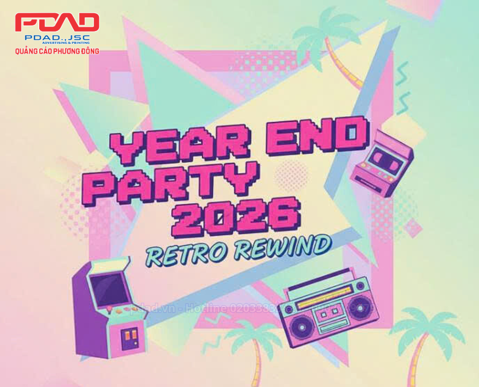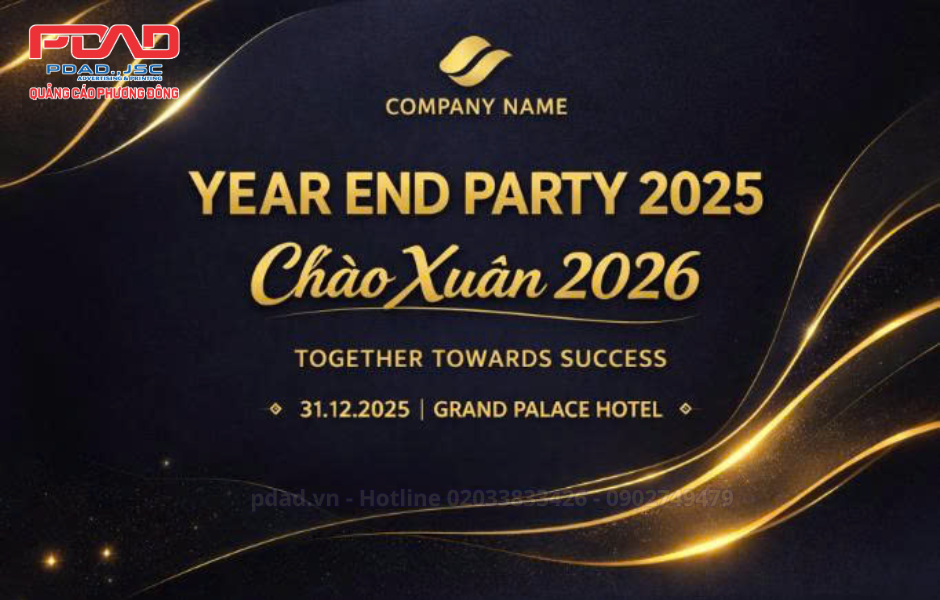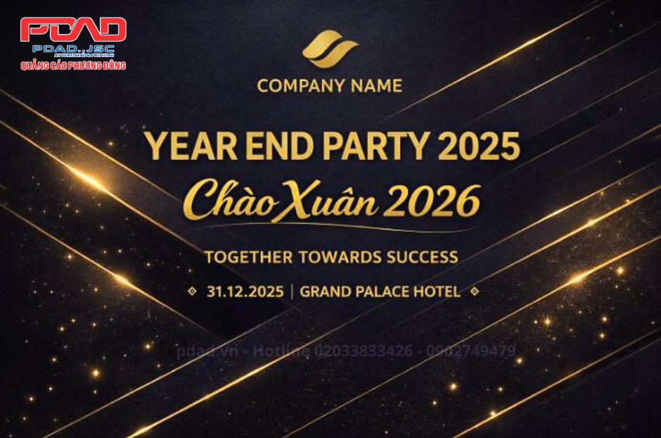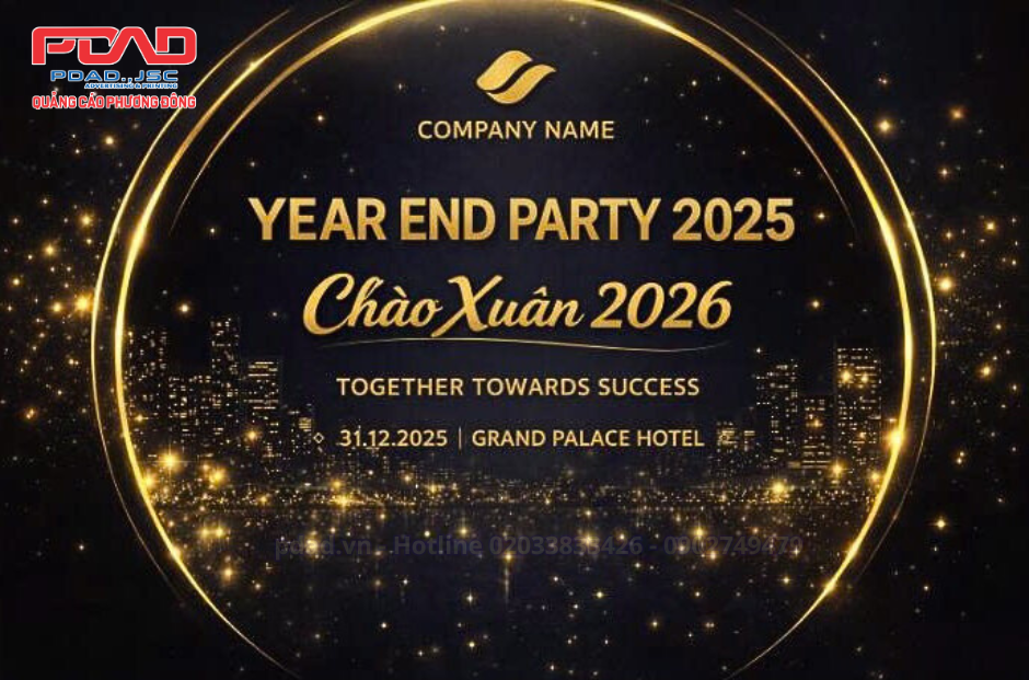 Ngoài in phông bạt tiệc tất niên và chào đón năm mới, chúng tôi cũng nhận thiết kế phông Year end Party 2026 để chiếu màn hình LED. Quý khách có nhu cầu vui lòng liên hệ: 02033 833 4260902749479 hoặc inbox cho fanpage Quảng cáo Phương Đông.