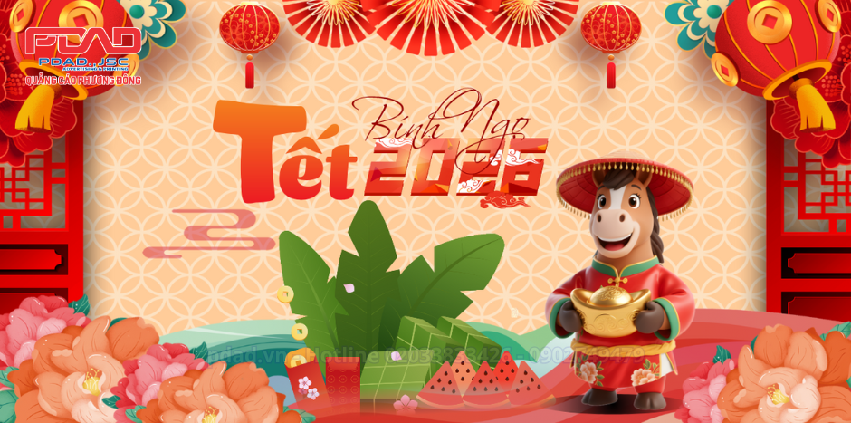 Phong cách này nổi bật với hình ảnh linh vật ngựa được cách điệu tinh tế, hòa quyện cùng những biểu tượng Tết truyền thống như hoa mai, hoa đào, bánh chưng xanh và câu đối đỏ rực rỡ. Tất cả được đặt trong gam màu chủ đạo đỏ – vàng, tượng trưng cho may mắn, tài lộc và một năm mới thịnh vượng, hanh thông.