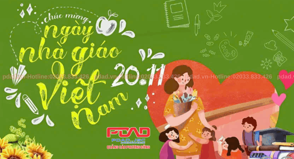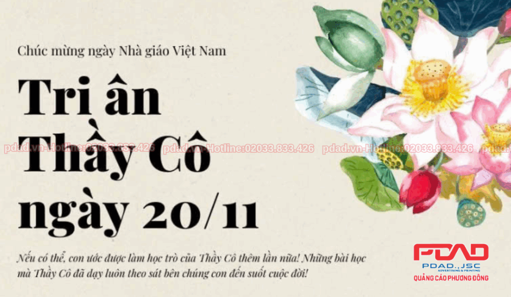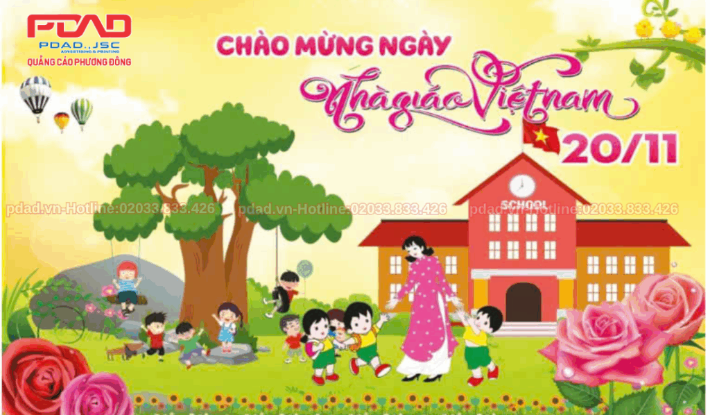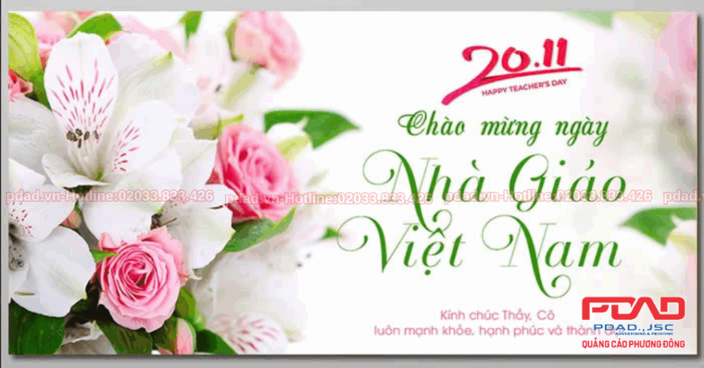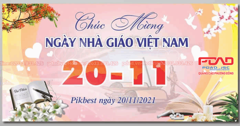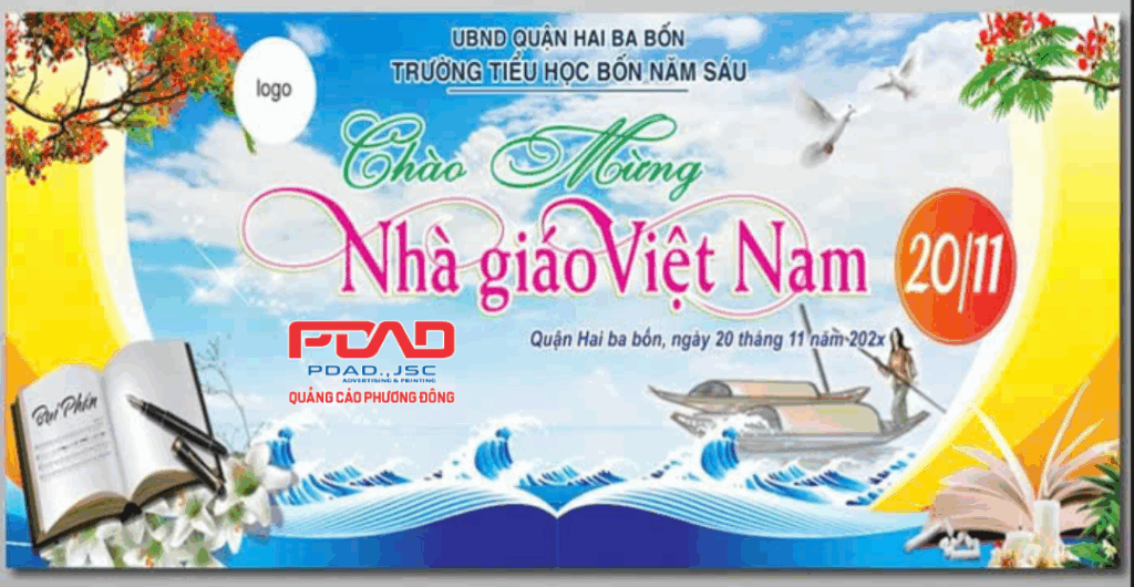 Phông nền ngày 20 tháng 11, đóng vai trò quan trọng trong việc tạo nên thành công của sự kiện. Với kinh nghiệm gần 20 năm hoạt động trong lĩnh vực in ấn tại Quảng Ninh. Quảng cáo Phương Đông thấu hiểu mọi tâm lý của khách hàng. Chính vì vậy, để đáp ứng nhu cầu in phông sân khấu cho ngày nhà giáo Việt Nam – 20/11 năm nay. Chúng tôi đã bố trí một đội ngũ chuyên thiết kế và in phông ngày 20/11 cho quý khách.