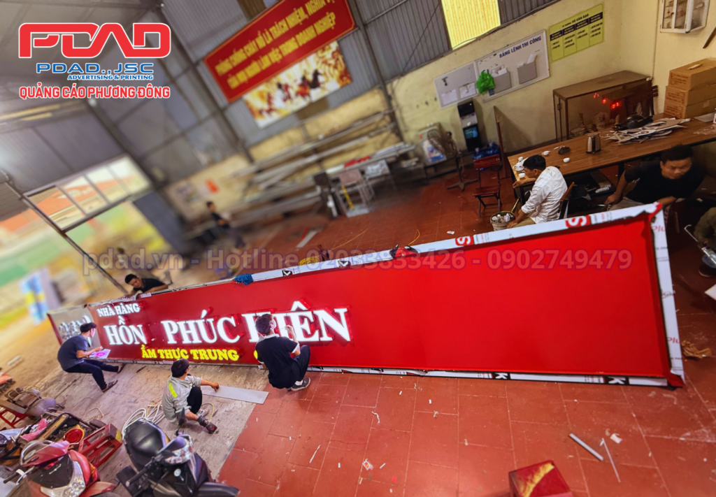 Thường với những biển hiệu quảng cáo cỡ lớn như thế này thì chúng tôi sẽ gia công hoàn thiện tại xưởng rồi sau đó mới chuyển ra công trình để thi công lắp đặt. Giúp tiết kiệm thời gian và chi phí.