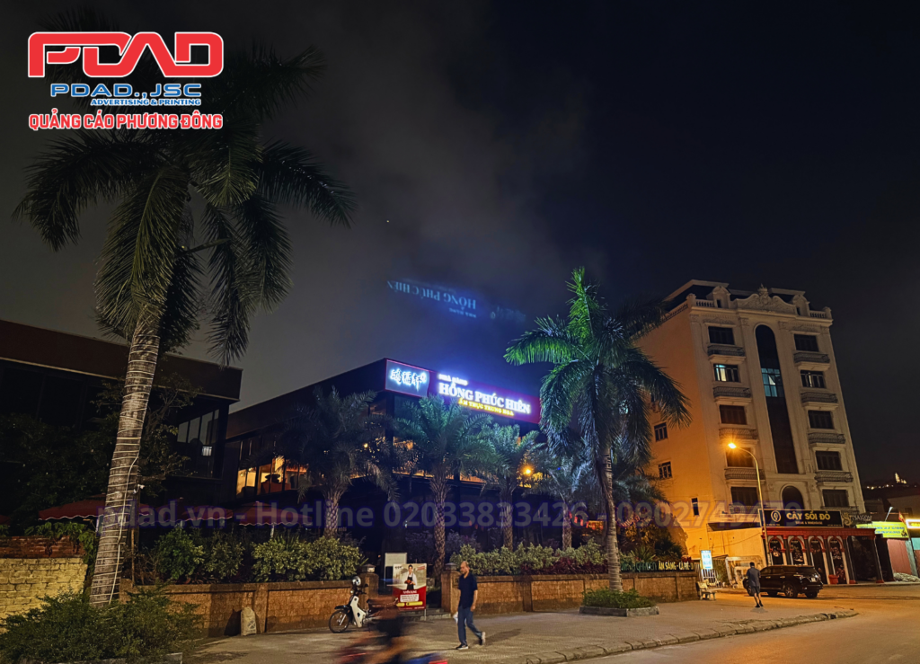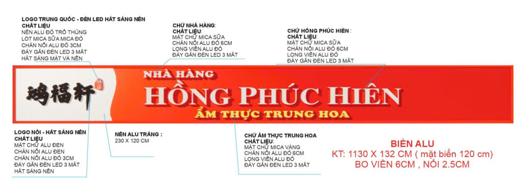 Biển quảng cáo nhà hàng Hồng Phúc Hiên có kích thước dài hơn 11m, cao 1m3, mặt biển hiệu rộng 120cm, bo viền 6cm và nổi 2.5cm. Nền biển hiệu là alu đỏ kết hợp alu trắng. Phần chữ nổi kết hợp mica sữa và mica vàng, chân nổi alu đỏ kết hợp đèn led 3 mắt hắt sáng chân và mặt.