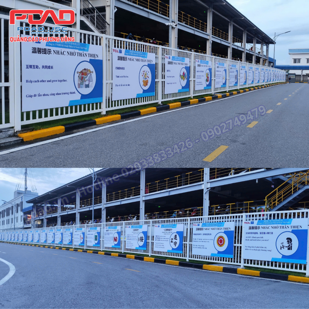 Ngoài ra biển quảng cáo bên trong khu công nghiệp thường là: biển ở cổng; biển trong nhà xưởng, biển tấm lớn dọc theo đường quốc lộ và hệ thống biển hiệu trong nhà máy… Chất liệu làm biển bảng trong khu công nghiệp, nhà máy đa dạng với nhiều loại khác nhau như mica, inox, đồng, alunimium, LED…